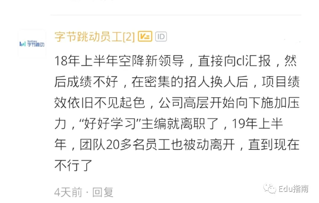在更早之前的2020年,Edu指南曾对字节跳动教育业务,做过复盘。当时已提到:好好学习,2020年以来,起码在公开场合,业务没有被额外提及,某种意义上,可能进入了“修炼期,或者是瓶颈期”。