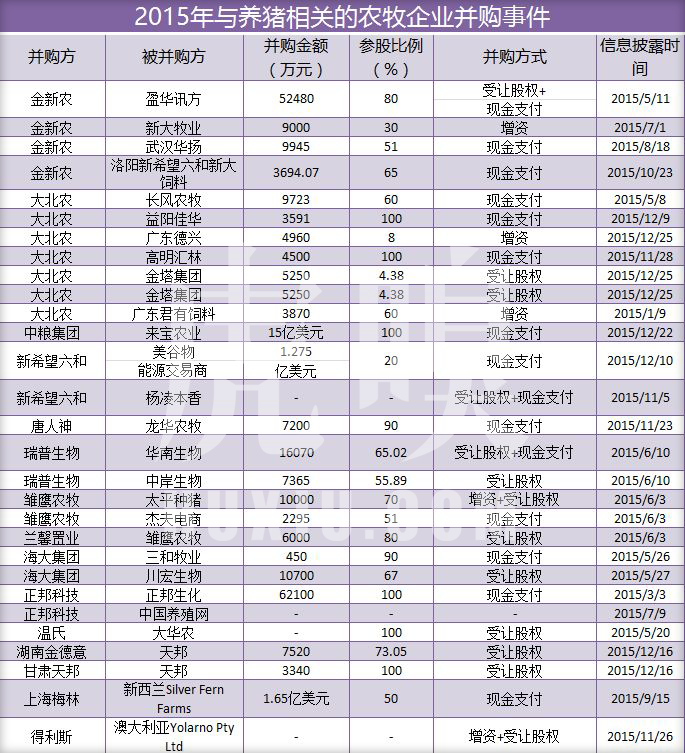 这也不是一家公司的问题。虎嗅发现,其实在2015年国内养殖行业正加速并购整合,其中公开披露的交易来看,就接近40家(如图):