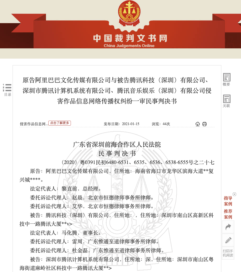 1月19日消息,中国裁判文书网于1月15日刊发原告阿里巴巴文化传媒有限公司与被告腾讯科技(深圳)有限公司、深圳市腾讯计算机系统有限公司、腾讯音乐娱乐(深圳)有限公司侵害作品信息网络传播权纠纷一审民事判决书。