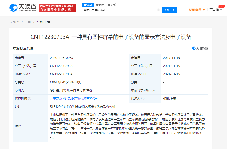 据天眼查APP显示,1月15日,华为技术有限公司公开一项名为“一种具有柔性屏幕的电子设备的显示方法及电子设备”的专利,公开号为CN112230793A,申请日为2019年11月15日。