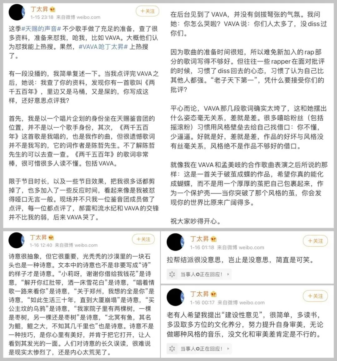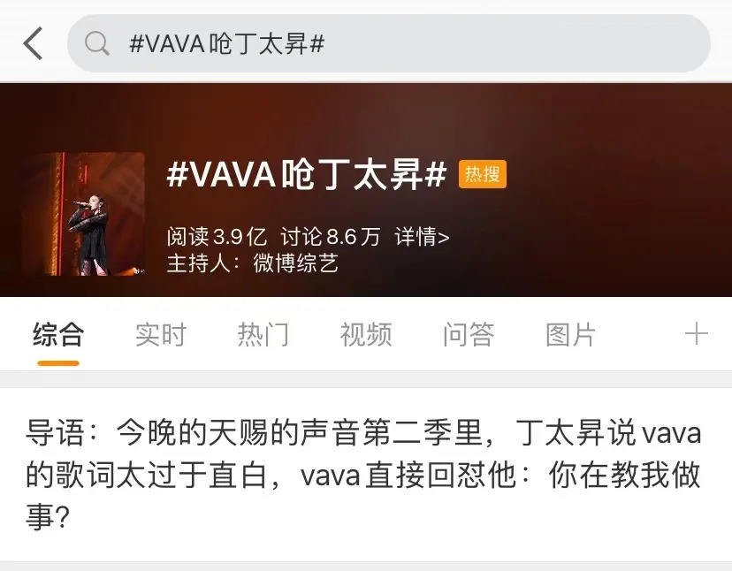 1月15日,《天赐的声音2》第一期开播,丁太升老师再次凭一己之力为节目带来了大部分热度,直接将话题#VAVA呛丁太昇(微博账号名)#顶上了热搜。后续,更是引起了包括当事人、其他乐评人、说唱圈、媒体,甚至是女权主义者在舆论场的多方角力,堪称一场“血雨腥风”。