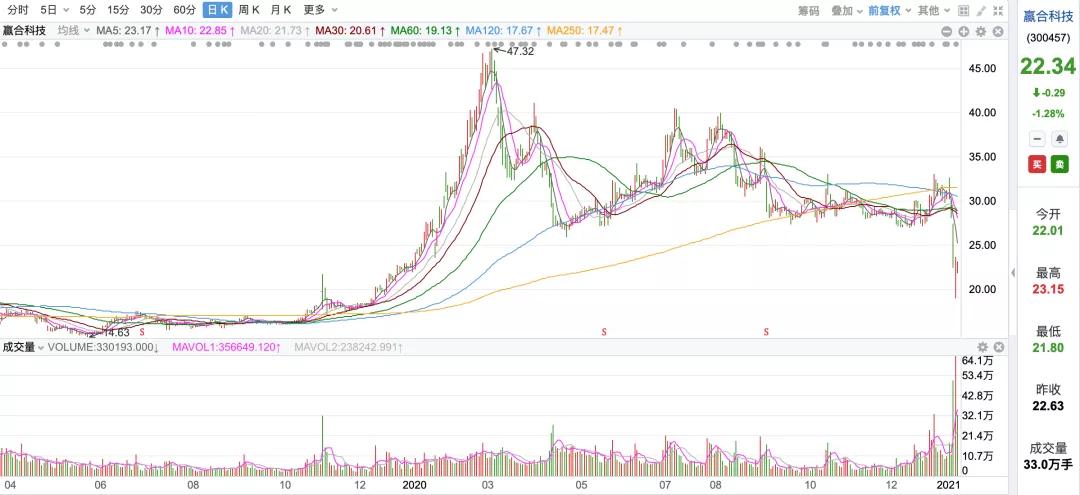 然而,赢合科技作为新能源车锂电池设备的供应商,股价却是在2019年11月前后,也就是公司公布股权转让的阶段,开始大幅上涨,经过近5个月的上涨,从17元/股,涨到2020年3月份最高的47.32元/股,此后股价大幅下跌到20多元/股。