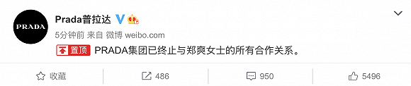 首当其冲的是1月11日刚刚官宣郑爽为品牌代言人的奢侈品品牌Prada。事件曝光后,话题#Prada股价下跌#一度登上微博热搜榜第四。新浪财经显示,截至1月18日下午16时,Prada当日股价下跌2.98%。此外,Prada官方微博下也涌入表示抵制的网友。