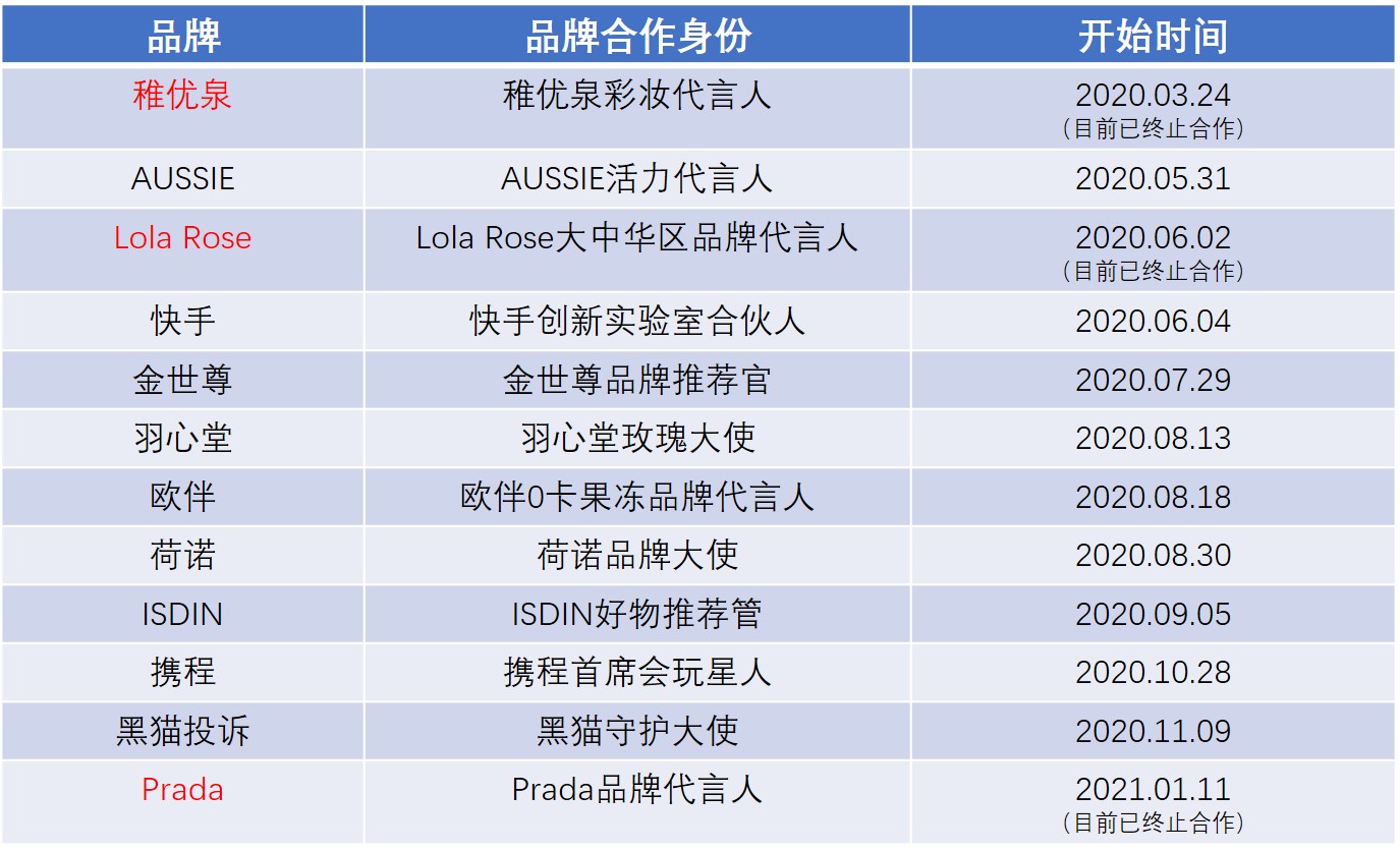 受到郑爽事件影响的品牌当然不止一个。据统计,在1月18日事件曝光前,郑爽共有12个商务合作和代言。截至1月19日下午,其中8个品牌方采取了行动。除了发布声明与郑爽终止合作的Prada、LOLA ROSE以及稚优泉外,AUSSIE和ISDIN品牌官方微博也清空了与郑爽有关所有内容,网络旗舰店也撤下了与郑爽合作的物料;携程、黑猫守护、欧伴这三个品牌则删除了郑爽单人的宣传微博。