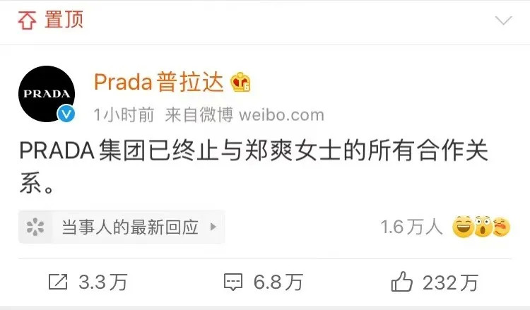可是Prada并不愿冒这样的风险,而是于19日晚间断然宣布:终止与郑爽女士的所有合作关系。