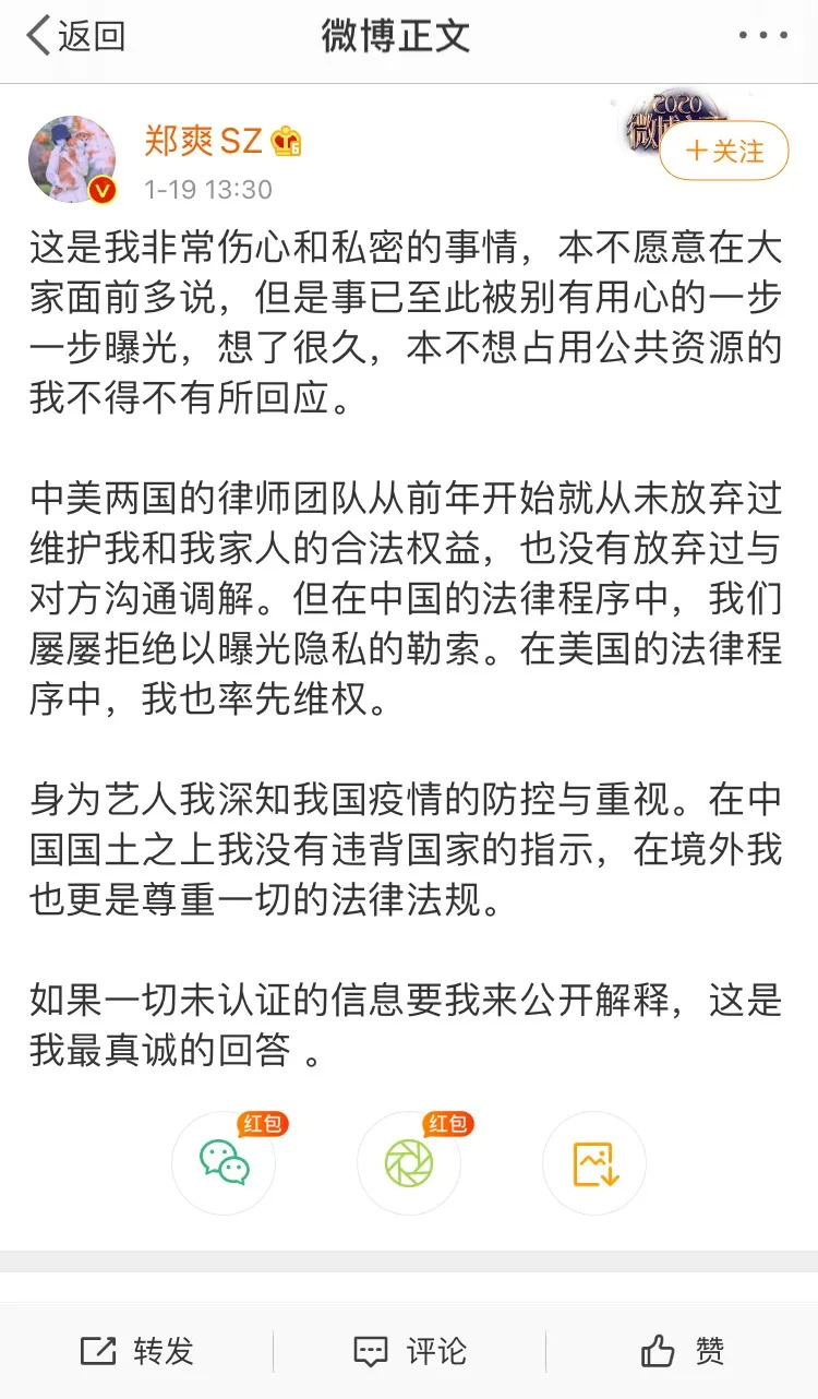 在声明中,郑爽还暗示“屡屡拒绝以曝光隐私的勒索”,似乎事件并非如其前男友方所声称的那样简单。