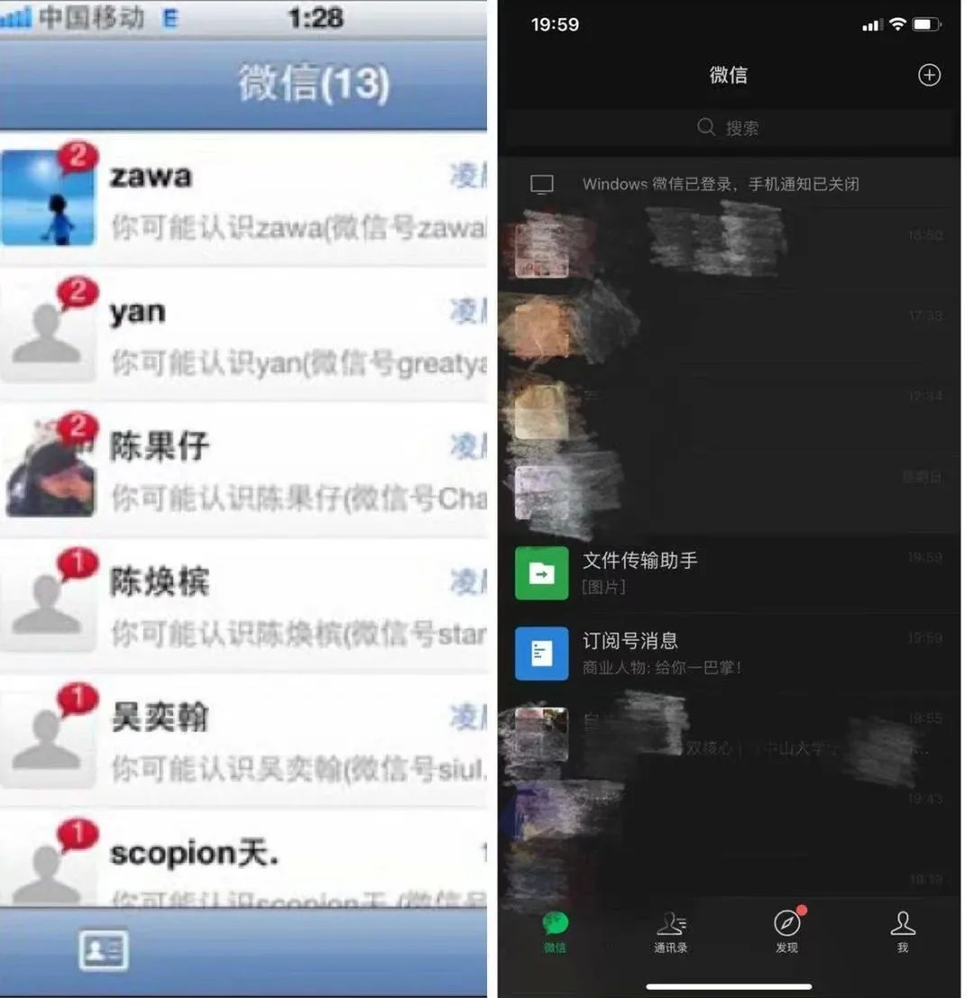 作为即时通讯的信息流页面,整体布局和十年前并无太大不同,十年后,只是增加了搜索、右上角的付款等功能、底边栏,社交流的变化微乎其微。