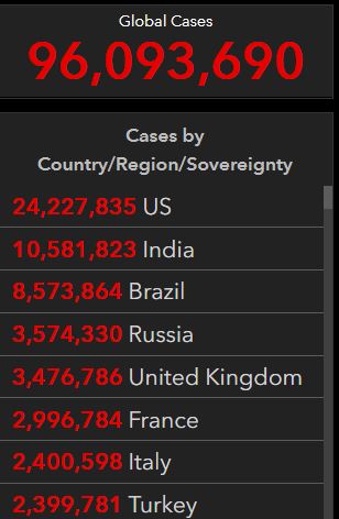据约翰斯·霍普金斯大学的疫情追踪数据,截至北京时间1月20日上午8点,全球累计确诊新冠肺炎病例96093690例,累计死亡2054132例。