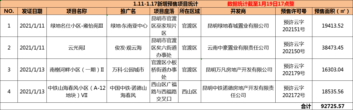从区域来看,上周获证的4个项目分别位于官渡区和西山区。其中,官渡区新增预售面积最多,绿地·东南亚中心、俊发·观云海及万科·公园城市3个项目获得了3张预售证,新增预售面积合计约7.4万方,占上周新增总预售面积的80%。