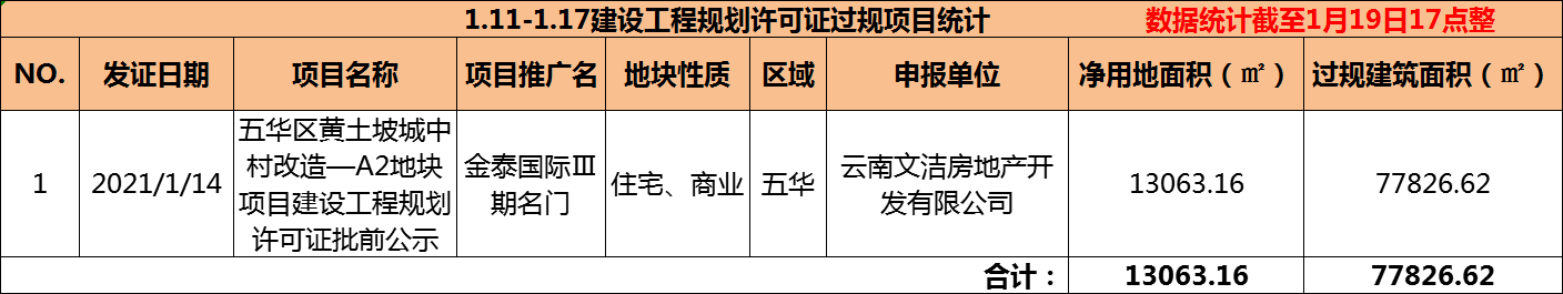 据昆明市自然资源和规划局数据显示,上周本地仅有金泰国际Ⅲ期名门1个项目过规,过规总建面约7.8万方,净用地面积约1.3万方。与前一周89万方过规总建面、45万方净用地面积相比,上周过规总建面环比下降91%,净用地面积环比下降97%。