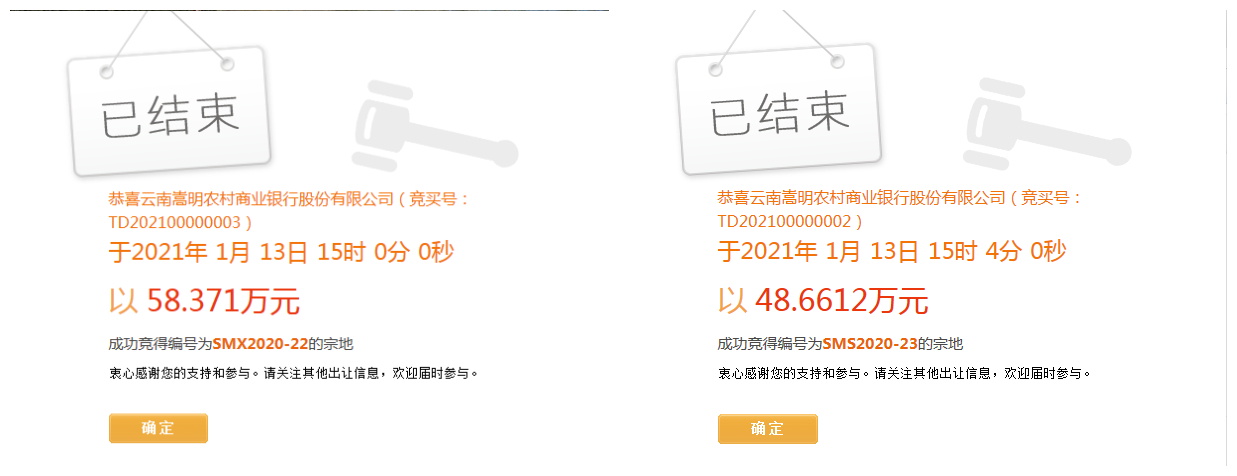 2宗位于嵩明县的土地均由云南嵩明农村商业银行股份有限公司摘得,其中1宗位于嵩阳街道办事处大营社区居民委员会面积约0.9亩的商务金融用地,成交价为48.6612万元,成交楼面价210元/㎡;另1宗位于小街镇本纳克村民委员会福寿村民小组面积约1.08亩的商务金融用地,成交价为58.371万元,成交楼面价约202.5元/㎡。