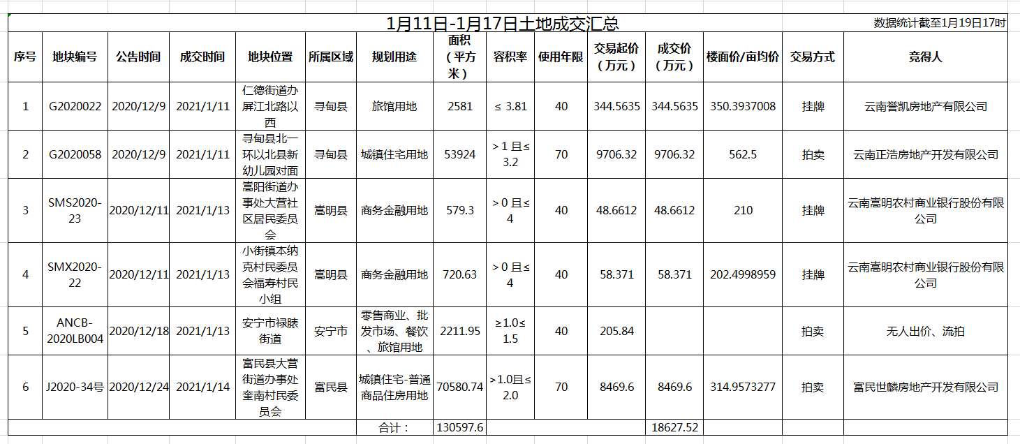 2宗位于寻甸县的土地入市成交,其中1宗位于仁德街道办屏江北路以西面积约4亩的商服用地,最终被云南誉凯房地产有限公司以334.56万元摘得,成交楼面价约350.4元/㎡;另1宗位于寻甸县北一环以北县新幼儿园对面,面积约80.89亩的居住用地,最终由云南正浩房地产开发有限公司以9706.32万元竞得,成交楼面价约562.5元/㎡。