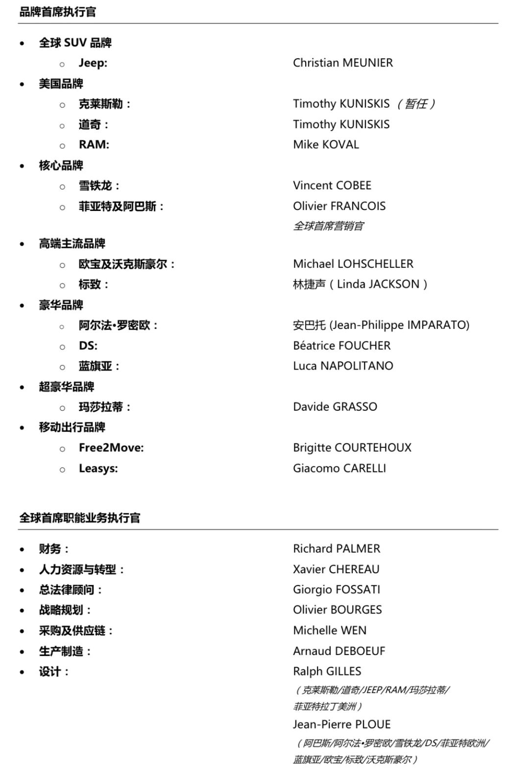“Stellantis集团”微信公众号1月20日消息,菲亚特克莱斯勒集团(FCA)与标致雪铁龙集团(PSA)合并组成的新汽车集团Stellantis集团任命了其全球最高管理团队及负责集团绩效和战略的九大管理委员会。名单显示,唐唯实任Stellantis集团首席执行官,奥立维任中国区首席运营官。