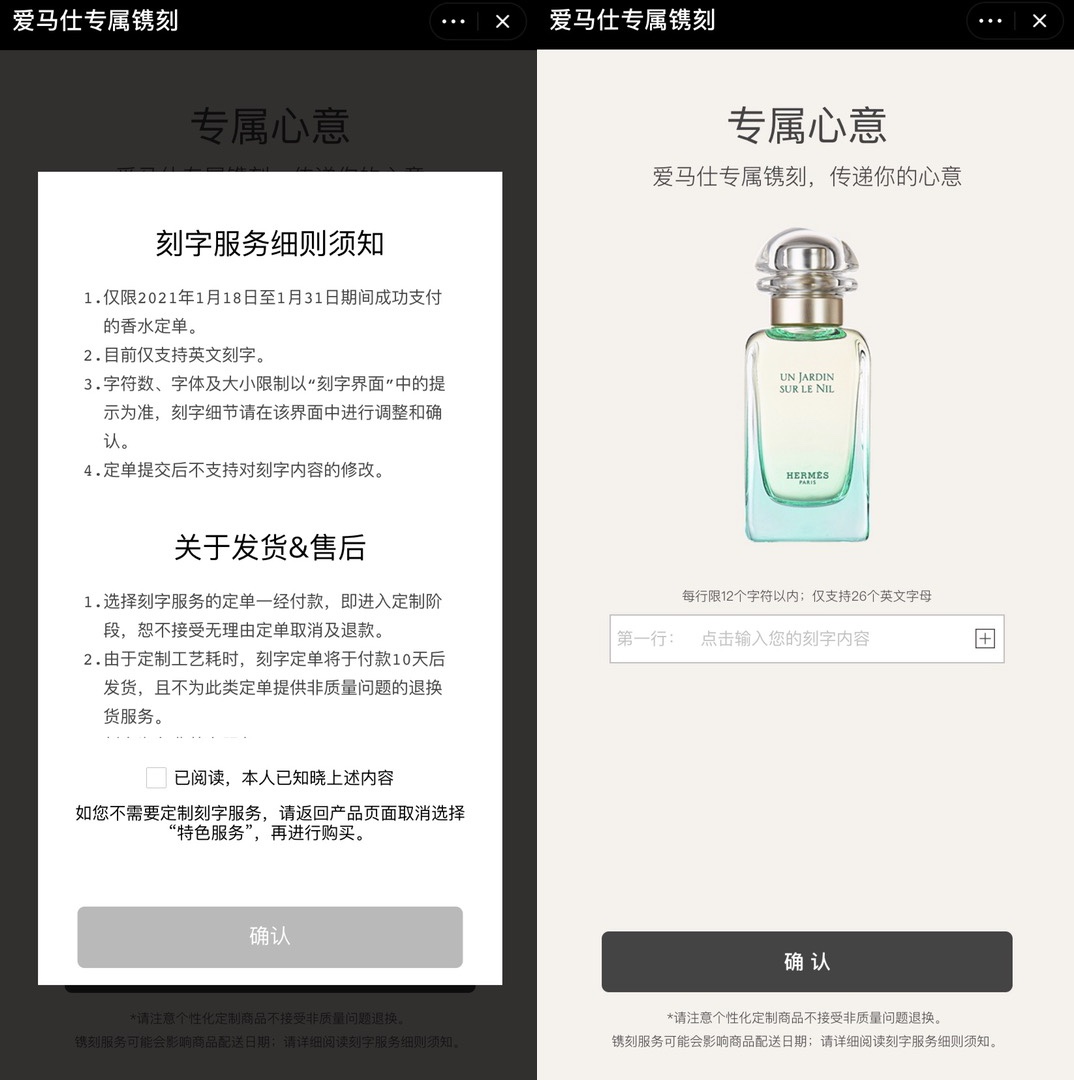 此外,1月18日至1月31日期间,爱马仕香水官方旗舰店还为顾客提供刻字服务,目前仅支持英文刻字。