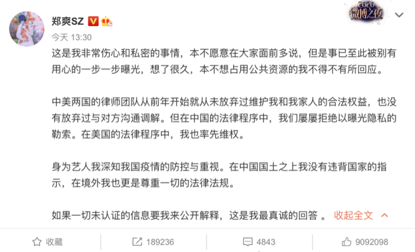 但客观来看,其目前暂未触及违法的领域,只是私德范畴内的“犯错”,倘若郑爽向公众道歉的态度诚恳,真正为孩子担起责任,但也难有口碑挽回的空间。