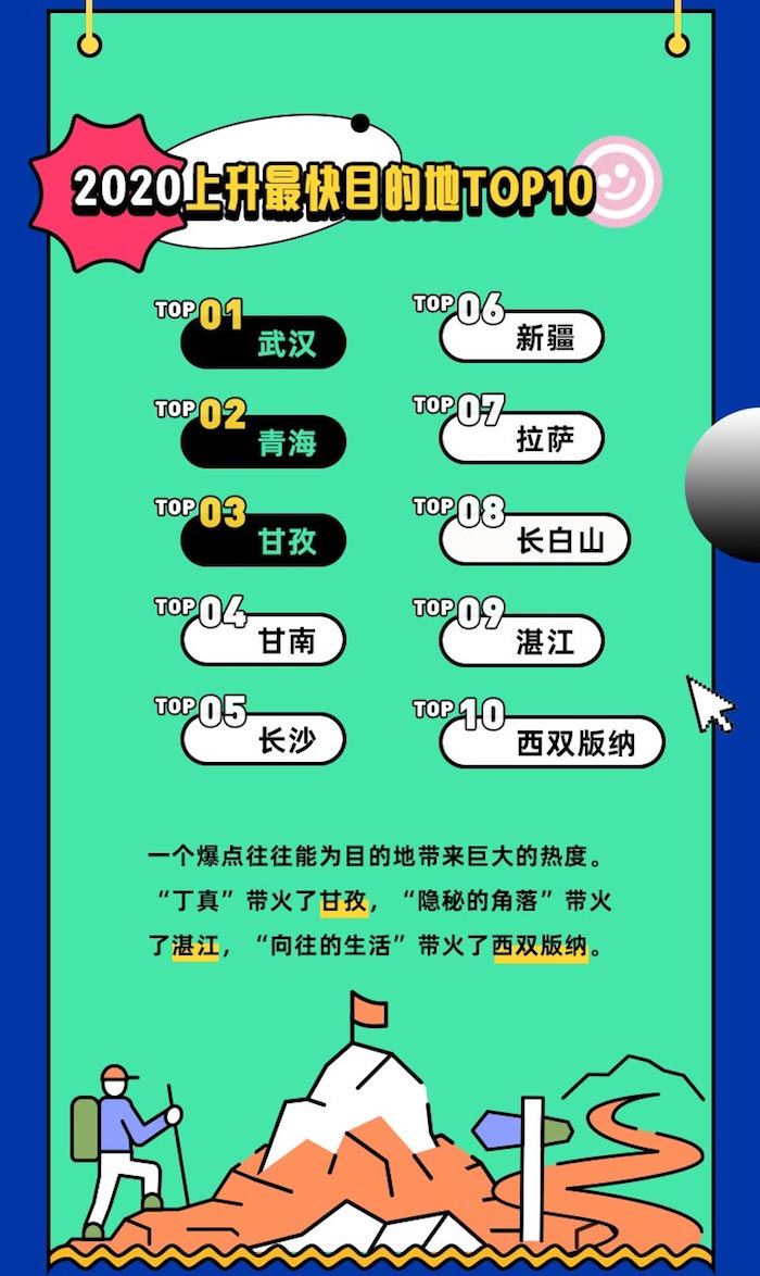 值得一提的是,今年热度上升最快的目的地中武汉位居第一,而随手一拍都是大片的青海排名第二,藏族小伙丁真以一人之力带火了四川甘孜排名第三。爆点往往能为目的地带来巨大的热度,热门网剧《隐秘的角落》拍摄地湛江、慢生活综艺《向往的生活》拍摄地西双版纳顺间吸引了大批游客的到访,也成功上榜“上升最快目的地TOP10”。