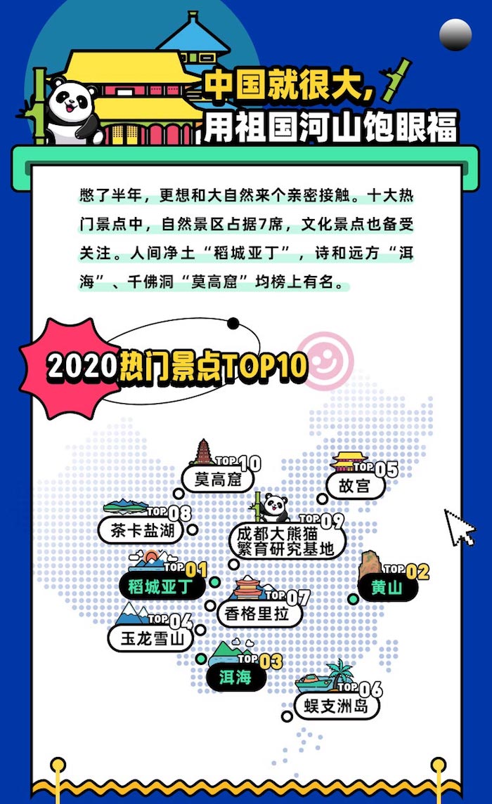 在“热门景点TOP10”中,自然景区和文化景点更受人们青睐。“人间净土”稻城亚丁,“诗和远方”洱海分别位列一、二位,拥有“千佛洞”美名的莫高窟也榜上有名。此外,一批过往相对小众的景点热度也不断攀升。拥有“中国版马尔代夫”之称的东台吉乃尔湖、电影《八佰》的发生地四行仓库抗战纪念馆、拥有完整苗族原始生态文化的西江千户苗寨,以及红叶满山的蛟河红叶谷相继成为人们的新选择。