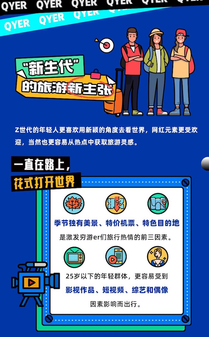 《报告》显示,在Z世代的旅行新主张中,更愿意去带有网红元素的目的地热度不减。同时,他们也更容易从热点中获取旅游灵感。季节独有美景、特价机票、特色目的地成为更能激发新青年们旅行热情的三大因素,而在线路选择上,他们会更容易受到影视作品、短视频、综艺和偶像因素的影响。