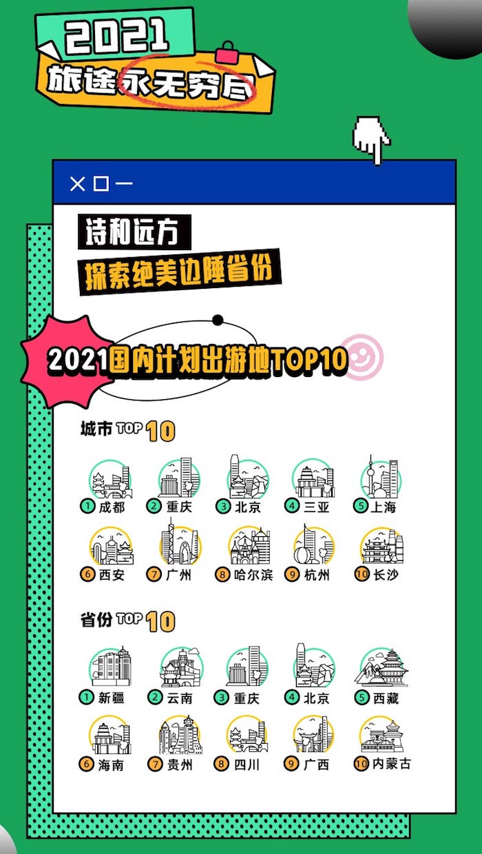 《报告》指出,从2021国内计划出游地排名来看,人们更愿意探索边陲省份。其中,新疆、云南、西藏、海南、贵州、广西、内蒙古等榜上有名。同时,美食、美景对人们的吸引力仍然巨大,成都、重庆、西安、广州、长沙等城市也都在他们的打卡计划中。