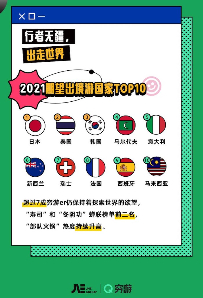 虽然出境游受阻,但出国游玩的期望值不会降低,超过70%的出境游人群仍然保持着探索世界的欲望,期望在2021年能出趟国游玩。《报告》显示,在“2021期望出境游国家TOP0”榜单中,“寿司”日本、“冬阴功”泰国、“部队火锅”韩国占据前三,度假胜地马尔代夫紧随其后。此外,欧洲对于国人仍有非常大的吸引力,意大利、瑞士和法国均上榜。