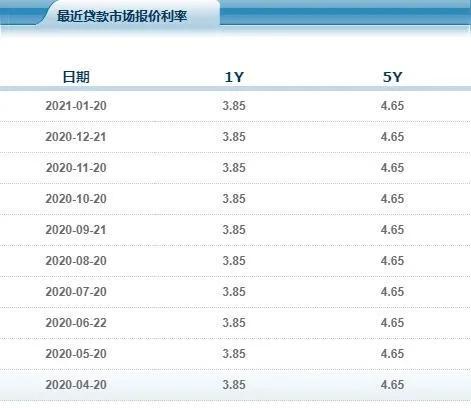 据中国人民银行授权全国银行间同业拆借中心公布,2021年1月20日贷款市场报价利率(LPR)为:1年期LPR为3.85%,5年期以上LPR为4.65%,均与上月持平。