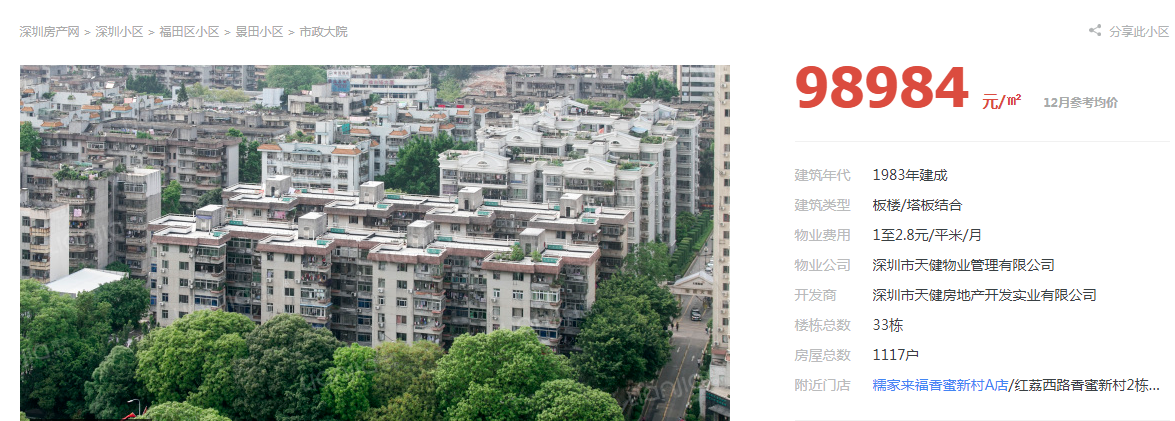 市政大院位于福田区红荔路与香梅路交汇处,紧邻鲁班大厦、香蜜新村等,建成于1983年,迄今已经有38年的楼龄。