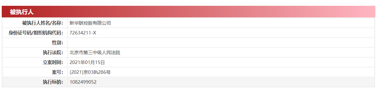 中国执行信息公开网消息,新华联控股有限公司新增一条被执行人信息,案号为(2021)京03执286号,执行法院为北京市第三中级人民法院,执行标的为1082499052元。