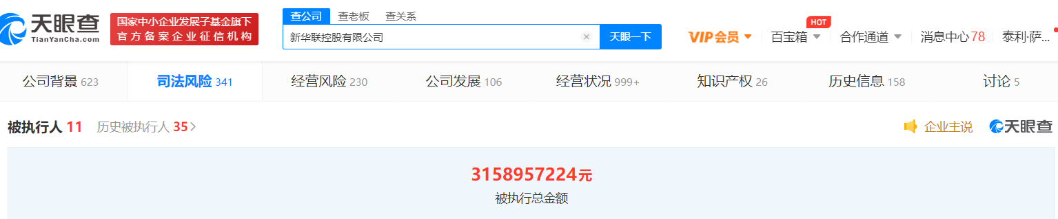 另据天眼查APP显示,新华联控股有限公司名下现存十余条被执行人信息,执行标的累计超31亿。