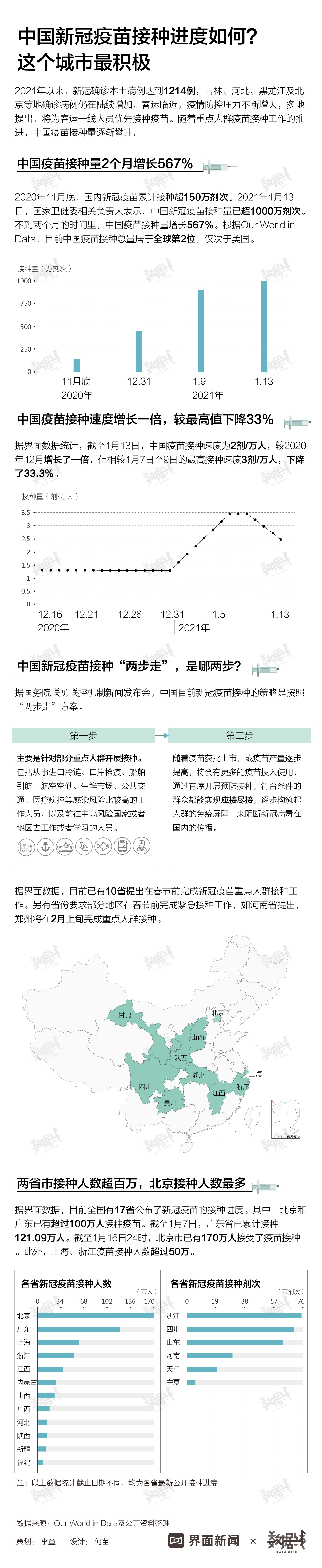不到两个月的时间里,中国疫苗接种量增长567%。其中,北京和广东已有超过100万人接种疫苗。