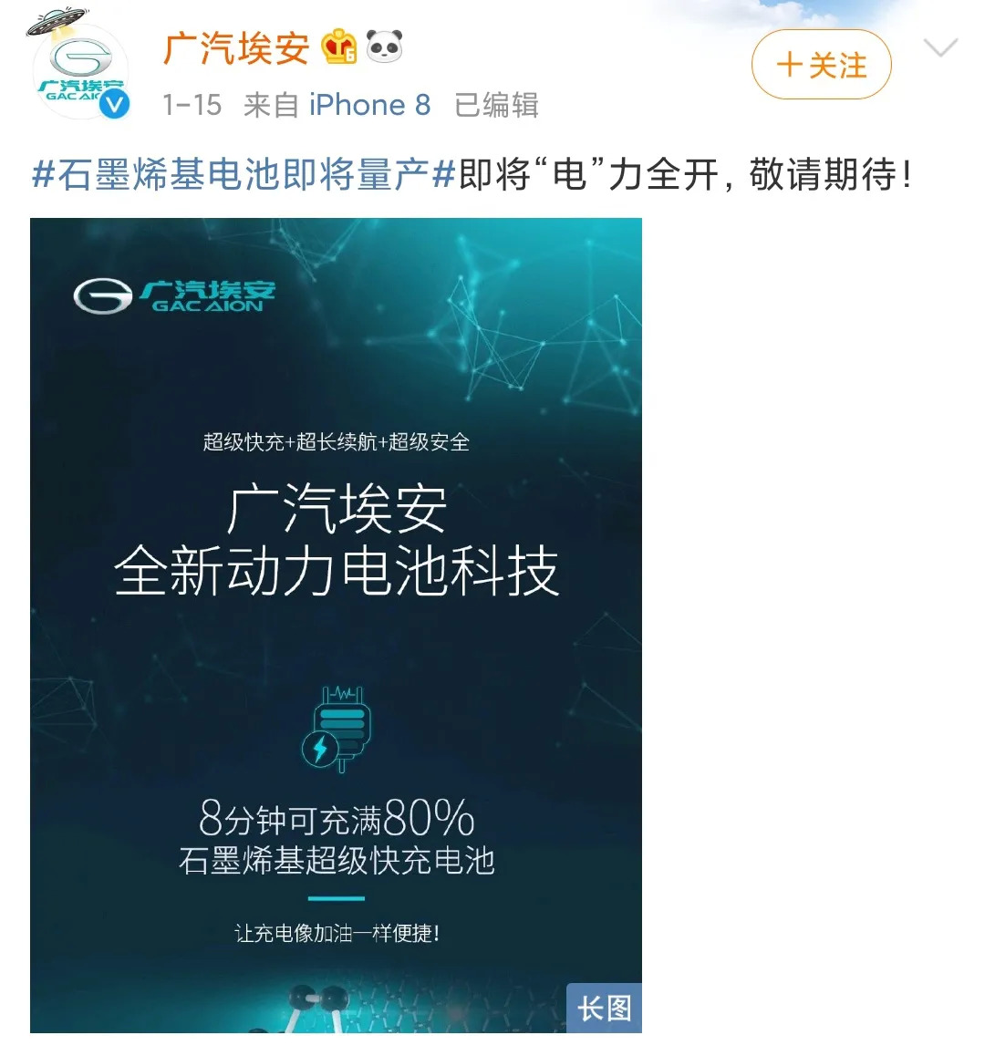 就在广汽正式发布新电池计划的前一天,包含这些字眼的一张预热海报出现在众多与新能源汽车相关的微信群及媒体消息中。该海报发布后,一度引起了行业内的关注和讨论,因为这将是车企研发石墨烯电池的首次落地。