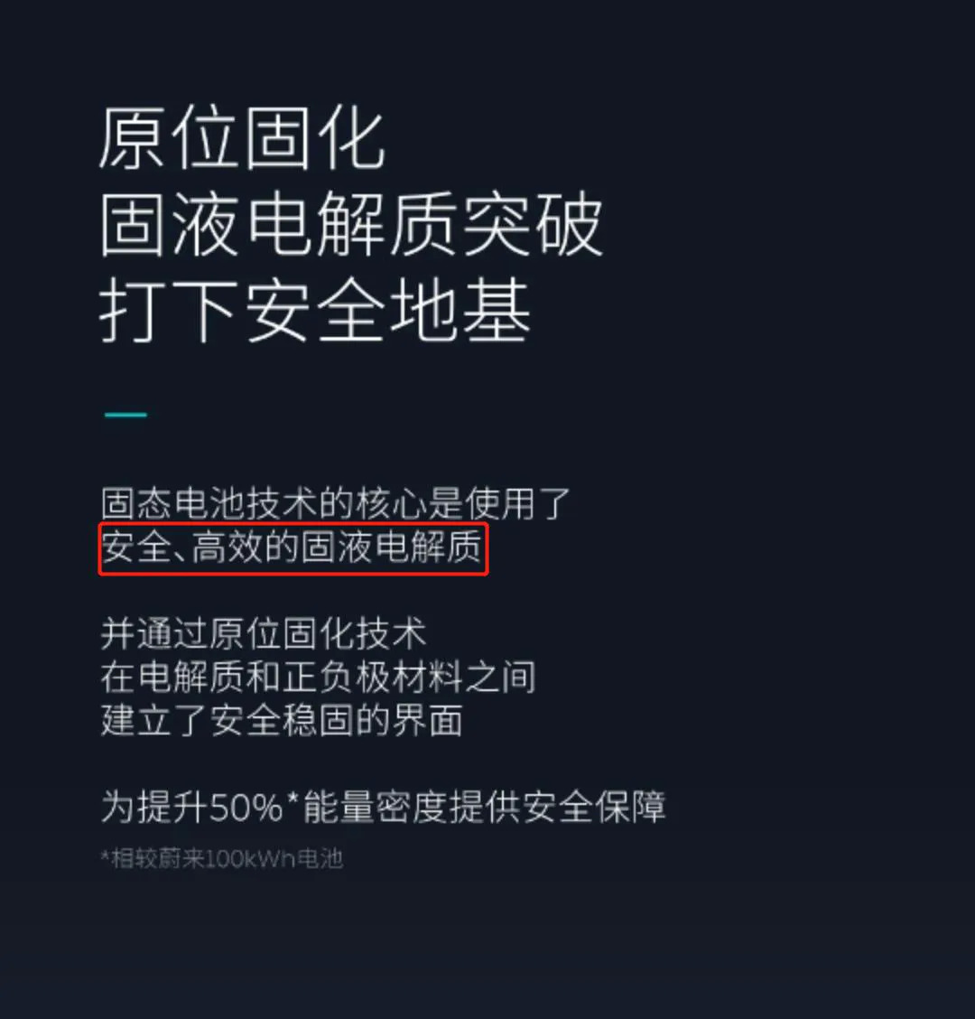 之所以蔚来能如此快推出所谓的“固态电池”,正是因为这款电池并不是真正意义上的全固态电池。如果仔细来看蔚来发布电池的宣传图,可以看到“使用了安全、高效的固液电解质”,这就是说,蔚来的这款新电池本质上只是固液电池。