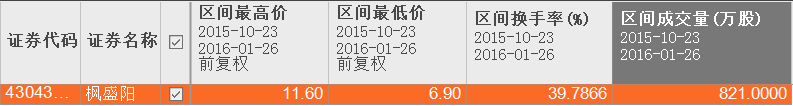 2015年7月7日,枫盛阳宣布筹划重大事项停牌,2015年10月23日终止重大事项复牌。复牌之后,枫盛阳股价震荡下跌,至今年1月27日跌破初始做市商的成本价7.20元。