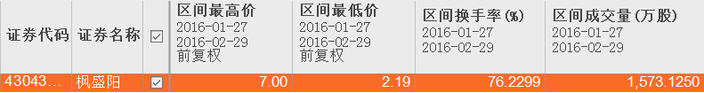 股东疯狂抛售导致成交量暴增,整个2月换手率高达75%,要知道枫盛阳从去年4月中旬开始做市起到当年末的换手率也只有95%而已。