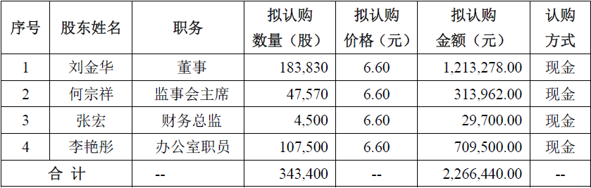 第一次增发价格为每股6.6元,募资226.64万元,发行对象为四名核心员工。包括董事刘金华,监事会主席何宗祥、财务总监张宏,办公室职员李艳彤。