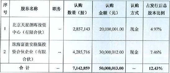 第二次增发价格7元每股,募资5000万元,发行对象为两家机构。北京天星朗晖投资中心认购285.71万股,珠海富盈安稳赢投资合伙企业认购428.57万股。
