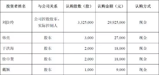 第三次增发价格9元每股,募资2999.7万元,发行对象为5名自然人。其中,枫盛阳实际控制人刘金玲资金认购了332.50万股,占比99.76%。