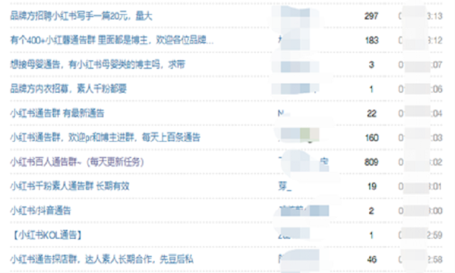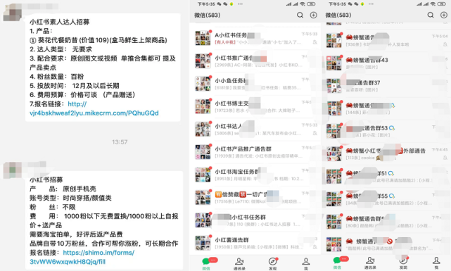 从商家的需求,到软文的写作、分发,后期的点赞等维护,也可统称为通告,在类似的通告群中,不停有各种品牌发布产品推广需求,通常会写明产品名称、对小红书达人、账号类型、粉丝数目的要求以及费用和投放时间。