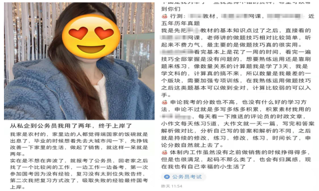 值得一提的是,笔记内容为令人艳羡的“国考上岸故事”,其中讲述了一位出身农村的女孩,在城市打拼两年后,回老家一边工作一边备考,第二次考试成功上岸。笔记在介绍行测和申论的练习方式、参考资料时,重点提到了所需推广的品牌。