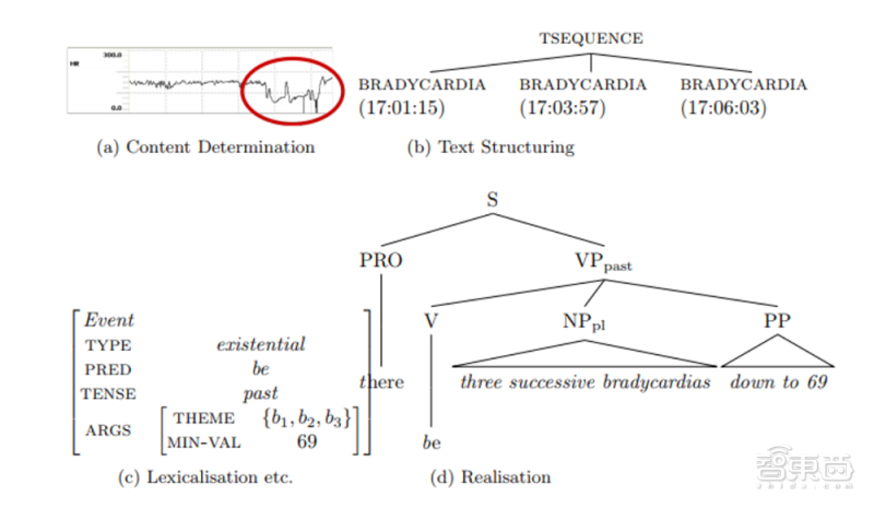 首先在内容确定阶段确定了文本需要描述新生儿的心率变化,在文本结构部分,找出了新生儿三次心率过缓的时间,按时间顺序排列。第三阶段包括了句子聚合、词汇化和引用表达生成,通过词向量的排列组合找到适合的词语,最后在实现阶段组成通顺的句子。