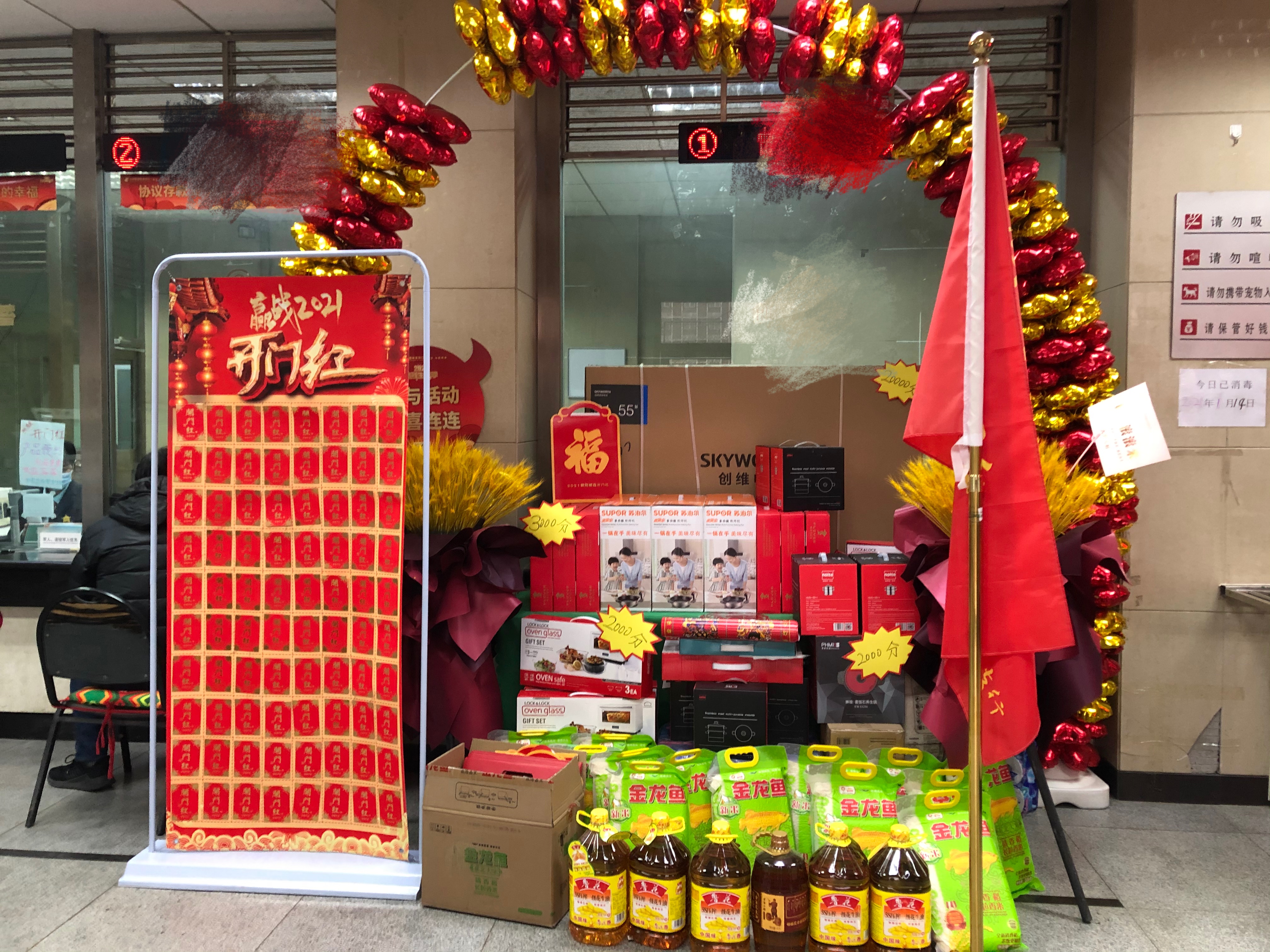 界面新闻记者走进某国有大行营业网点,一进门就看到大厅正中间有一个彩色的气球拱门,拱门下的桌子上整整齐齐地摆放着礼品——大米、粮油、床上四件套、锅具、烤箱、电视,在一堆礼品的旁边竖着一张贴满红包的红色展版,上面写着“赢战开门红”。