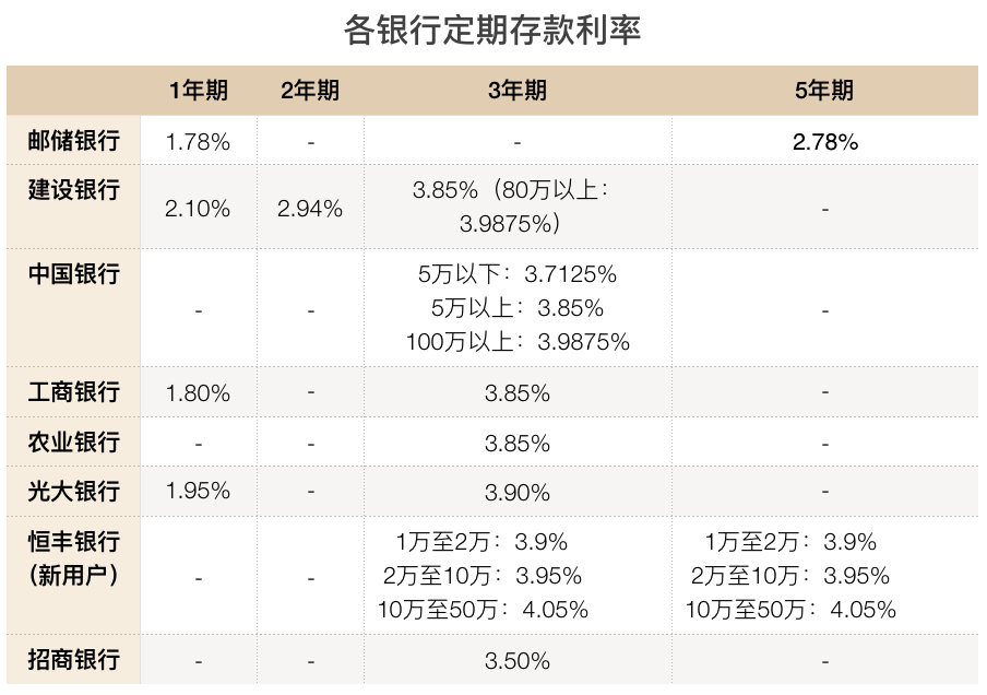 建设银行北京某网点理财经理则表示,他们银行当前1年定期存款的年利率为2.1%,2年为2.94%,3年为3.85%,但在近期,80万以上的3年定期存款可以申请到年化利率3.9875%。