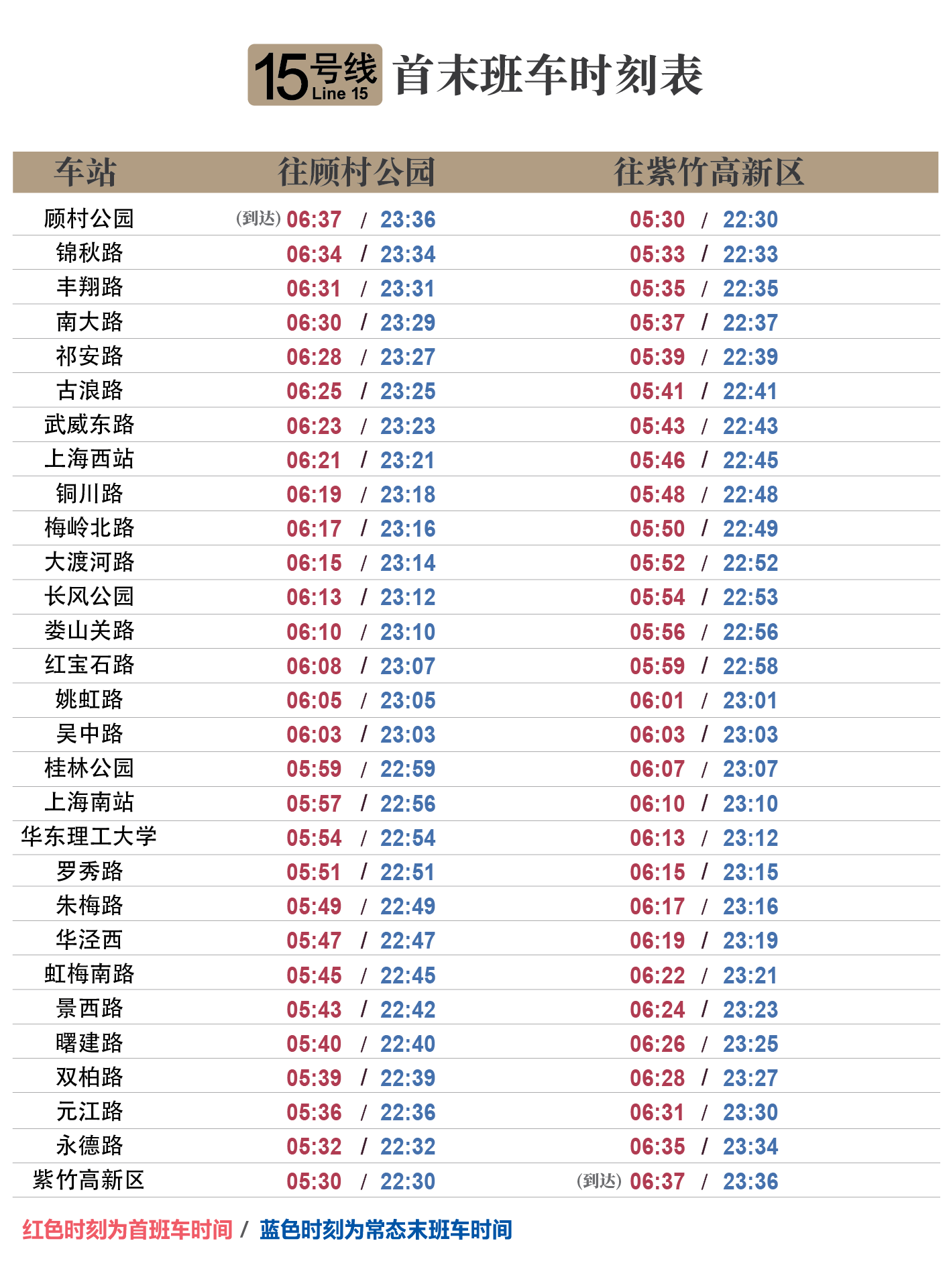 15号线开通初期运营后,全线常态运营时间为5:30至23:36。紫竹高新区站及顾村公园站首班车发车时间均为5:30,末班车发车时间均为22:30。
