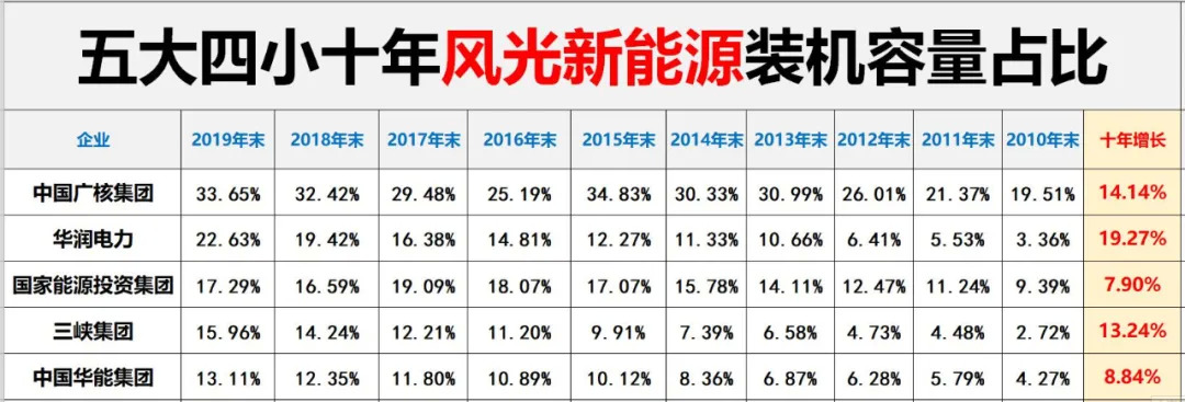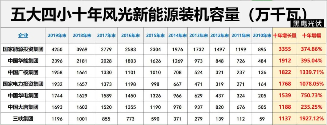 黑鹰光伏曾统计过,十年前,“五大四小”的风光新能源(部分企业还含有部分其他新能源品类)的装机容量只有2539万千瓦,十年后,截止2019年末则达到了16298万千瓦,十年时间增幅达到惊人的541.91%。而对于未来的新能源发展,电力央企的规划愈发清晰,决心愈加坚定。