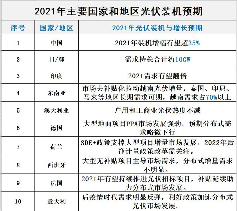 全球诸多国家加大对光伏产业的扶持力度。截止2019年,新增装机规模超过1GW的国家已经超过15个。历经2020年的增长,“光伏GW级国家”的数量肯定还在增加。截止2021年底,至少21个地区市场光伏装机需求达到GW级水平。