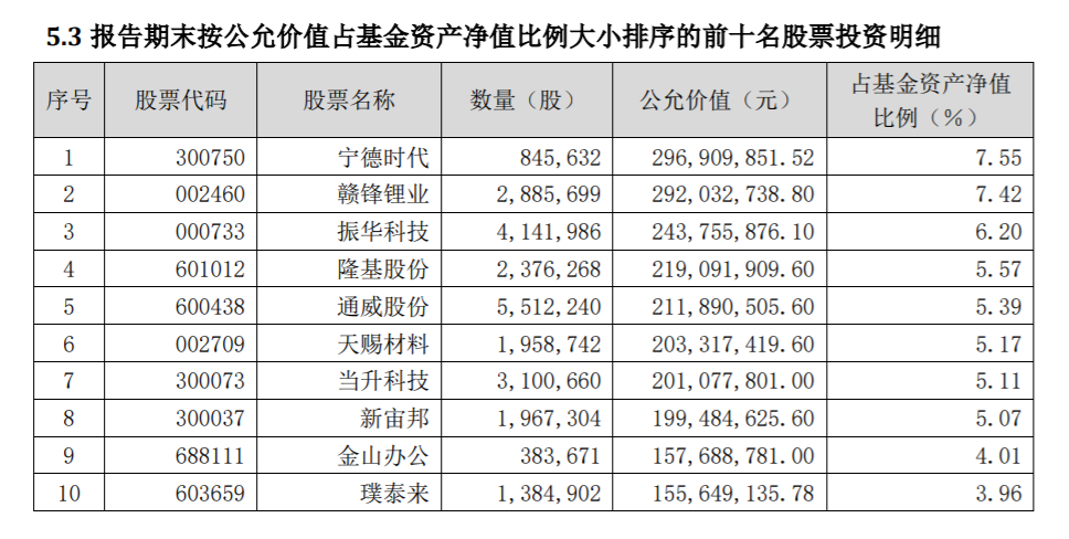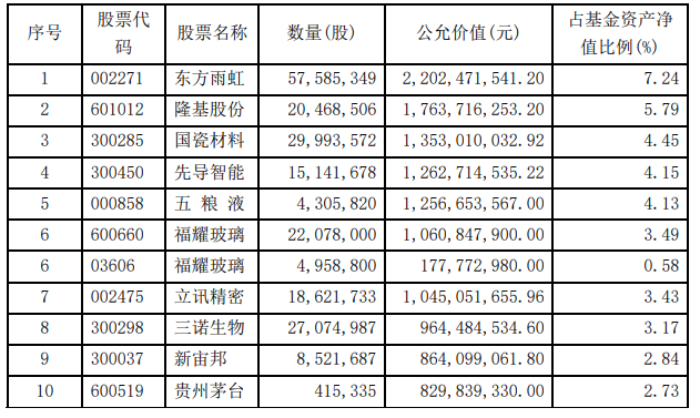 该基金四季度末的前十大重仓股分别为:东方雨虹、隆基股份、国瓷材料、先导智能、五粮液、福耀玻璃、立讯精密 、三诺生物、新宙邦、贵州茅台。
