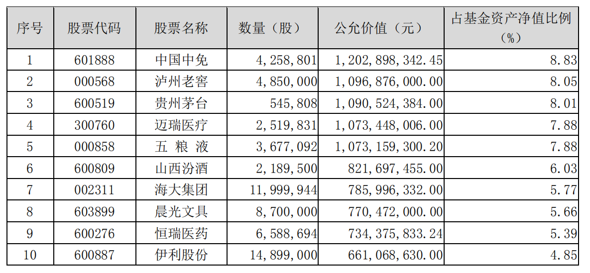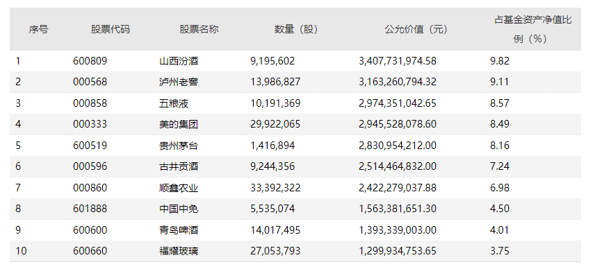 从十大重仓股来看,萧楠仍重仓持有白酒股。该基金前十大重仓股分别为:山西汾酒、泸州老窖、五粮液、美的集团、贵州茅台、古井贡酒、顺鑫农业、中国中免、青岛啤酒、福耀玻璃。十大重仓股中白酒股占6只,合计占基金资产净值的近一半。