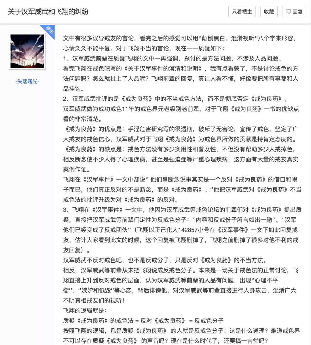 日日知非:《【知非声明】我对《戒为良药》的态度与“转载流通《走向光明》哪种版本”的郑重说明》,戒色论坛主号,2020