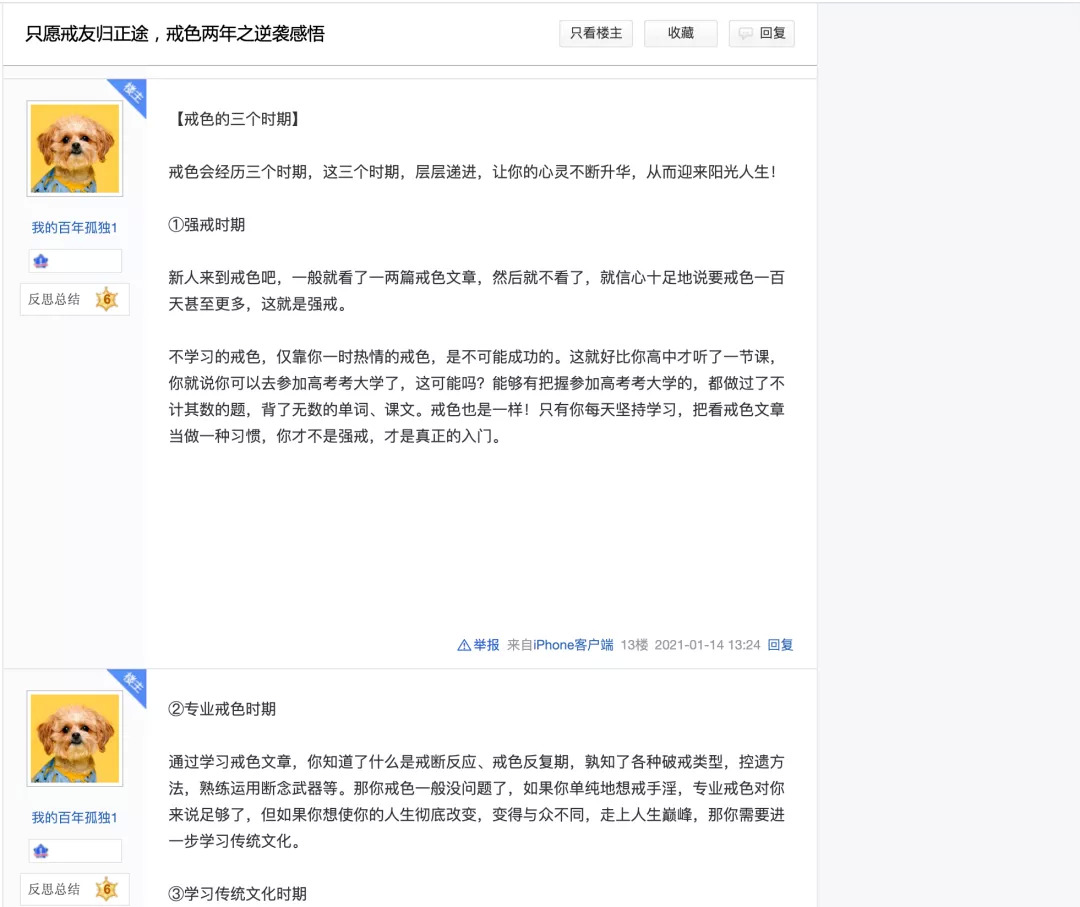 戒色吧的精品贴中,能看到无数靠戒色“走上人生巅峰”的成功案例。就这样,戒友们一边苦行僧般坚持戒色,一边憧憬前辈分享的“戒除邪淫”后的各种美好人生。