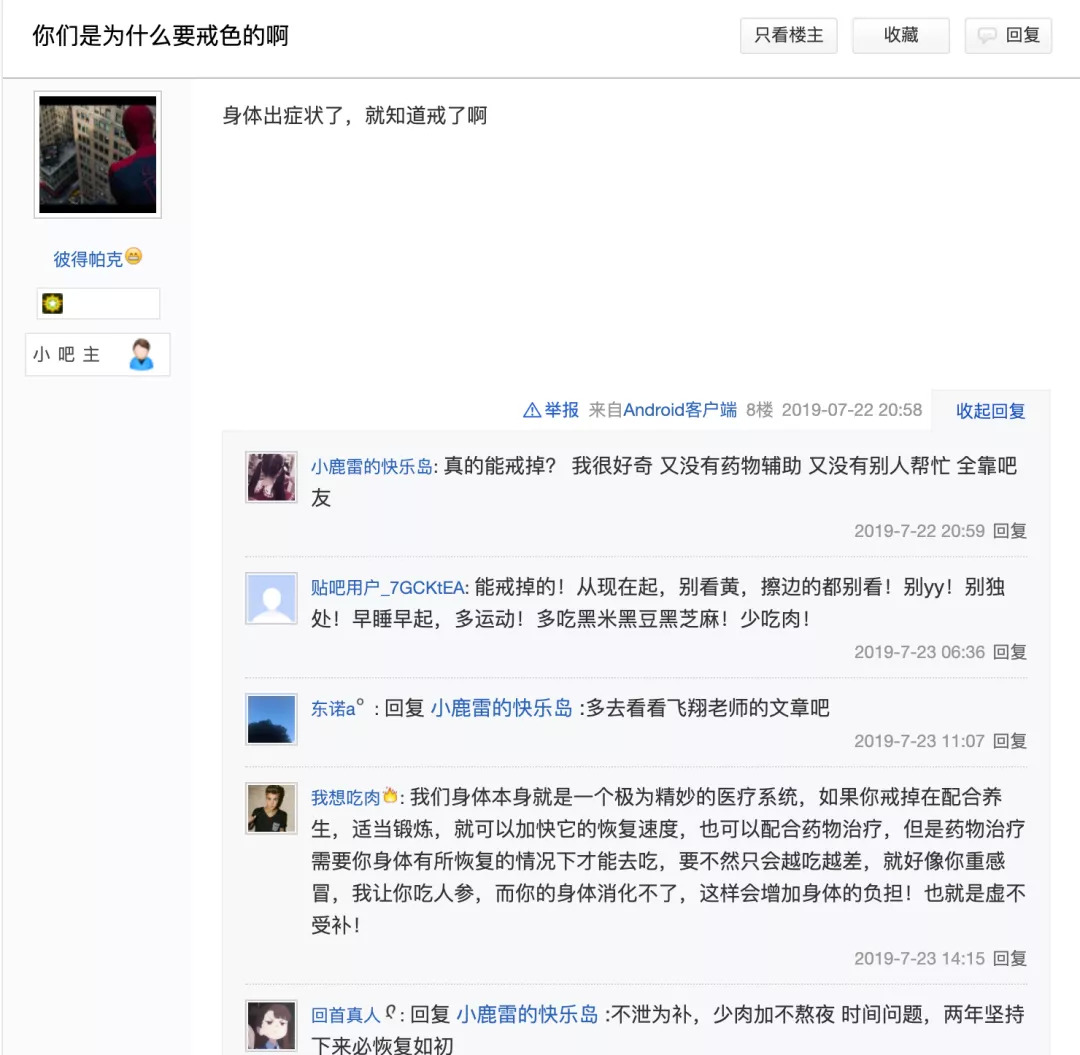 而在戒色吧一帖“你们是为什么要戒色”的近600条回复中,有人称“撸管”导致身体出了毛病,戒手淫是为了摆脱阳痿、早泄等症状。更多人将手淫与龌龊、不健康挂钩,戒手淫是为了“不再猥琐地活着”,为了恢复斗志,迎来美好生活。