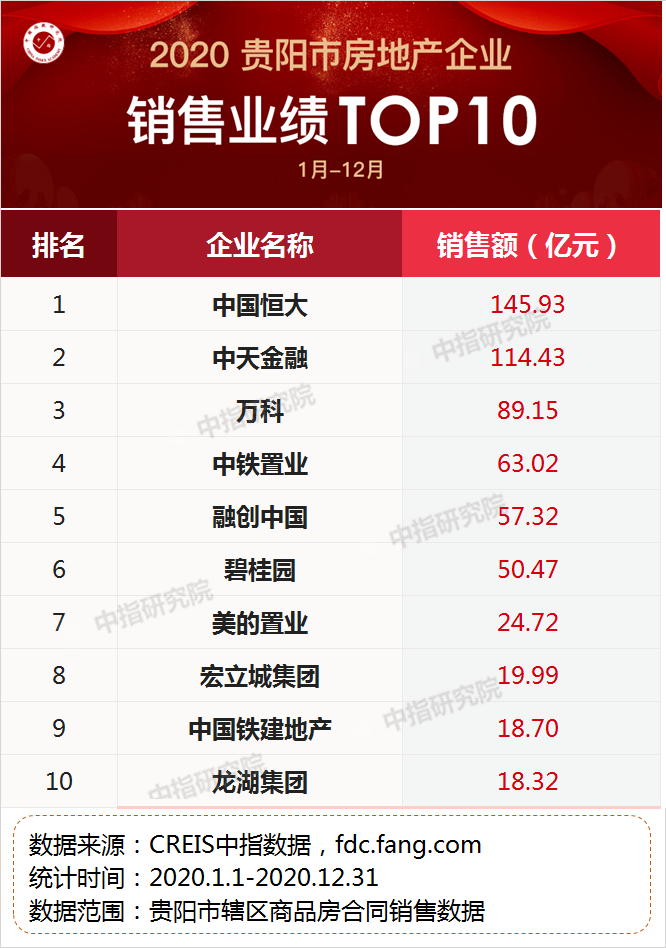 中指研究院发布了2020年贵阳房地产企业销售排行榜,恒大集团以145.93亿元的全年总销售额,占据榜首。